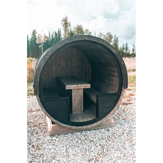 Ein Saunafass Klassik in Kombination mit einem Tauchbottich, wie dem Harvia Frosty, intensiviert das Saunaerlebnis durch den kalten Sprung. Die Abkühlung im Tauchbottich sorgt für tiefere Entspannung.